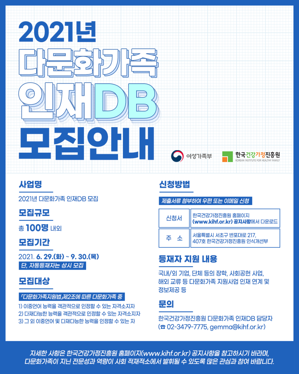| 2021년 다문화가족 인재DB 모집 안내 (0) | 2021.07.15 |