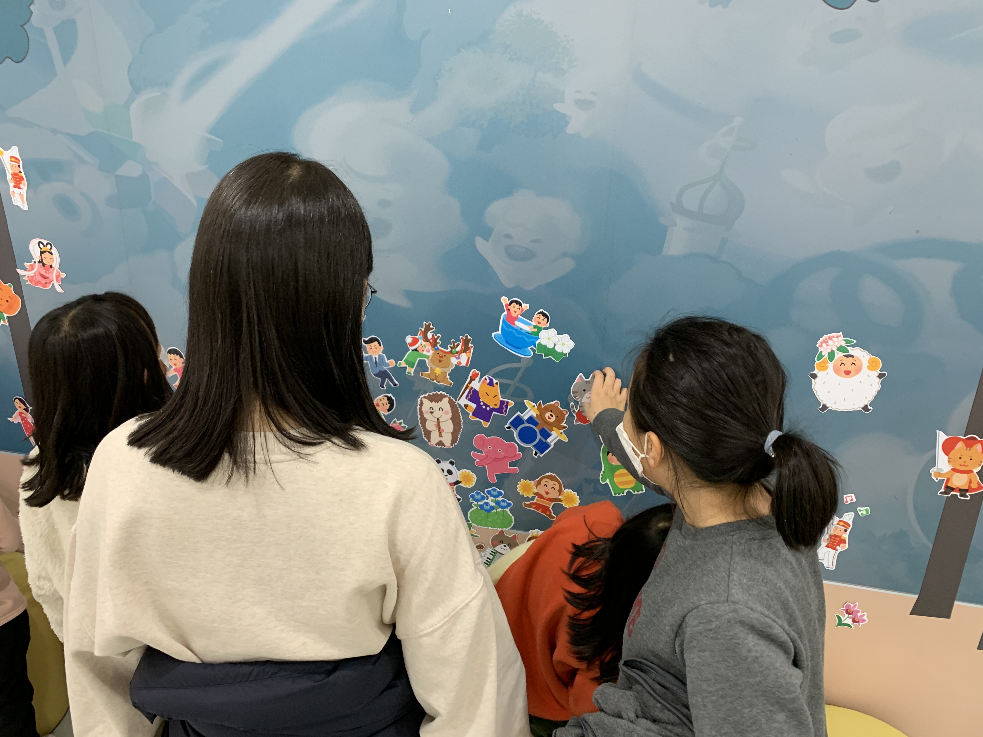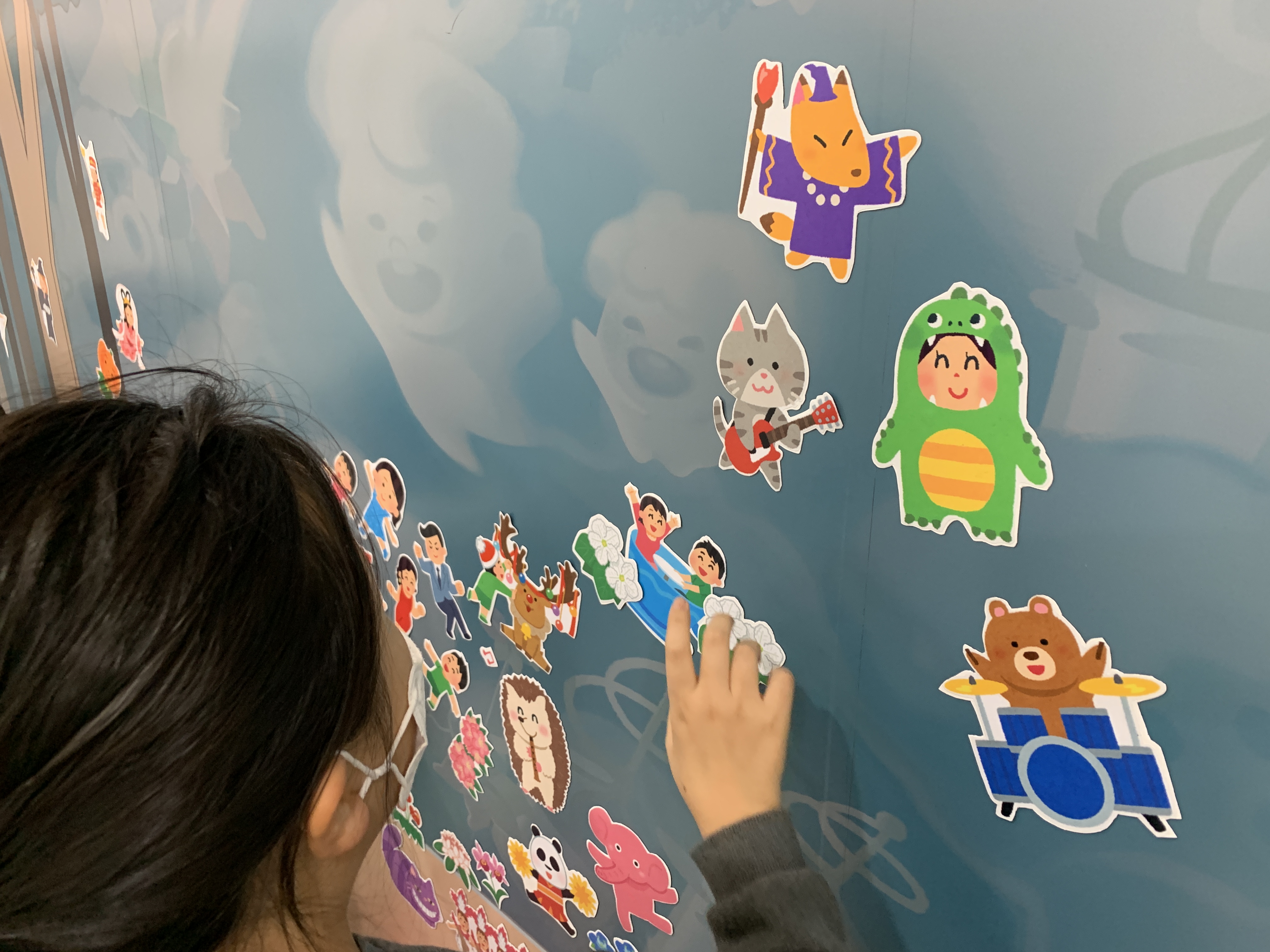 실내 벽면에 자석스티커 놀이를 할 수 있는 공간이 있습니다.